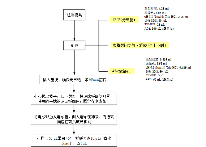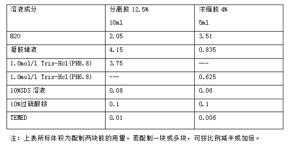 0.1g過硫酸銨+1ml雙蒸水。使用前新鮮配制(5)Tris–甘氨酸電泳緩沖液的配制(25mmol/L Tris;250mmol/L甘氨酸(pH8.3))