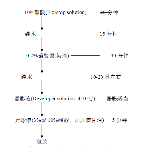 移去夾子,取下玻璃板,將膠從玻璃板上小心取下,切去一角或兩個角作為記號,以便于辨認,然后開始銀染處理,處理均在搖床上進行,具體步驟如下: