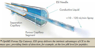 CE與其極性和帶電荷的分析物,如代謝物,堿性藥物和肽一起工作。其分離完全蛋白,高度帶電的肽和非常難以解析的蛋白復合物的能力將提供LC-MS不容易實現的新信息。傳統上,CE-MS已經使用同軸噴霧器進行,其添加鞘液和霧化氣體以實現穩定的ESI噴霧。這種同軸的“三管噴霧器”設計,雖然功能,導致樣品稀釋和信號減少。Beckman Coulter的新型CESI 8000高性能分離-ESI模塊與OptiMS技術提供了**商業無護套CE-MS噴霧器,為研究人員提供了一個強大的高靈敏度接口,利用高效,低流速的CE分離。