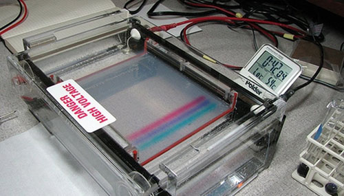 該罐通過緩沖溶液,再通過瓊脂糖凝膠產(chǎn)生電流(范圍為50至150 V)。瓊脂糖凝膠的孔位于電流的負極(陰極),凝膠的另一端位于電流的正極(陽極)。